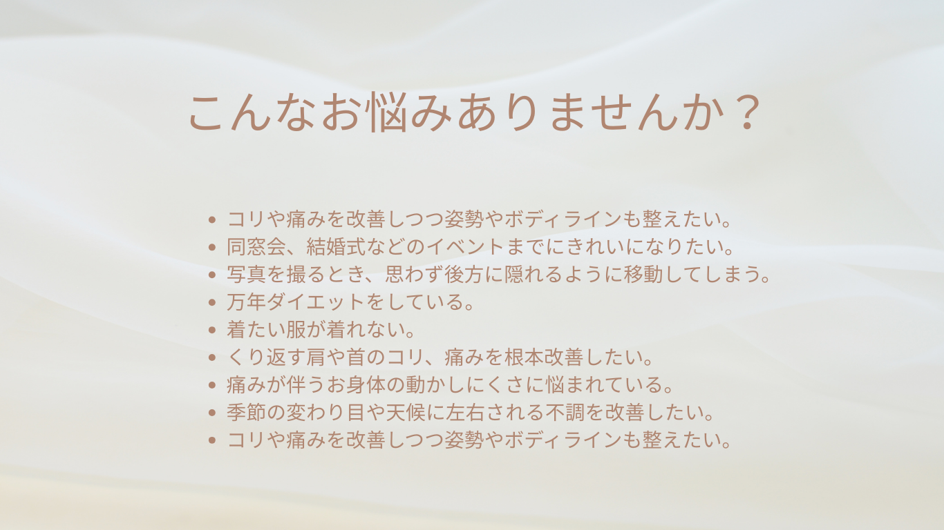 - コリや痛みを改善しつつ姿勢やボディラインも整えたい。